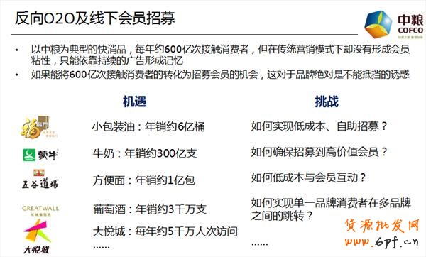 周穎還把這個(gè)體系做進(jìn)一步的暢想,如圖,中糧為典型的快消品,每年約600億次接觸消費(fèi)者,但在傳統(tǒng)營(yíng)銷模式下卻沒(méi)有形成會(huì)員粘性,只能依靠持續(xù)的廣告喚起記憶。
