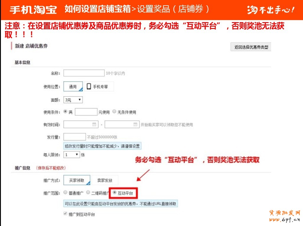 獎池要設置以下內容:獎池名稱,主要是方便與寶箱活動綁定,獎池有效期(注意,獎池有效期應大于寶箱活動時間,否則設置不成功,且獎池與活動綁定后,時間不能修改),單個買家的中獎頻率和次數(shù),選擇獎品,獎池中的獎品可以選擇手機流量包,店鋪優(yōu)惠券,商品優(yōu)惠券及實物贈品;獎品如果是店鋪優(yōu)惠券或者商品優(yōu)惠券,都需要到營銷平臺設置新的券,且在設置券的時候,必須勾選“互動平臺”,否則獎池無法獲取。