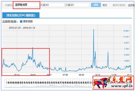 看這個(gè)圖,我們可以做出一些基本判斷:粗跟的高跟鞋會(huì)從2月初到2月中旬左右的時(shí)候,市場(chǎng)需求呈下降的趨勢(shì),但是從2月中旬開始,一直到4月份,都是快速上升的。所以,如果做粗跟高跟鞋的話,從這個(gè)結(jié)論推斷,就可以這樣做:2月初的時(shí)候就開始準(zhǔn)備,在2月中旬的時(shí)候把基礎(chǔ)打好(包括做出一些基礎(chǔ)銷量等等),然后在2月中旬開始大力推廣,上直通車啥的,很容易就到了首頁(yè) !4月份開始減少推廣,順其自然即可!