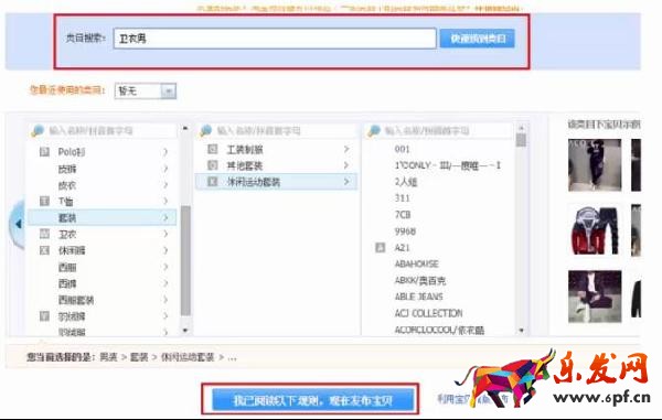 比如,這里小編給大家示范的輸入“衛衣男”,點擊快速找到類目,下方就會跳出許多我們需要選擇以及勾選的類目,根據實際情況勾選,完成后點擊【我已閱讀以下規則,現在發布寶貝】