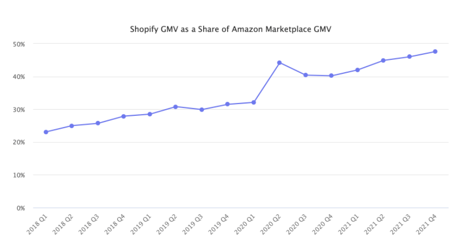 從一整年情況來(lái)看,Shopify的GMV,達(dá)到了亞馬遜平臺(tái)的45%。甚至,在(2021)第四季度達(dá)到亞馬遜的48%,創(chuàng)造歷史高點(diǎn)。
